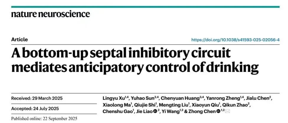 2025年9月22日,浙江中医药大学陈忠教授团队在《Nature Neuroscience》上发表最新研究成果,揭示了一条从内侧隔核(Medial septum, MS)到穹窿下器官(the subfornical organ, SFO)的抑制性神经环路,参与饮水行为的预测性控制。这一发现为理解体液平衡和相关疾病提供了新视角。