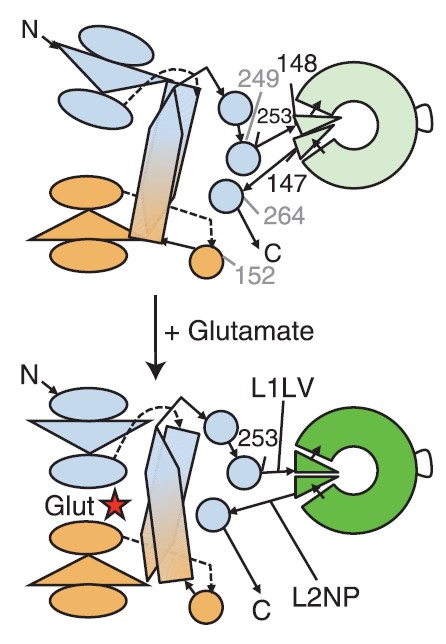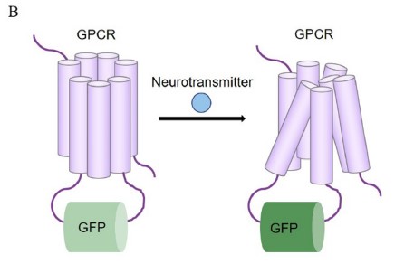 利用可与神经递质相结合的G蛋白偶联受体(GPCR)作为探针的骨架,成功开发出一系列新型可遗传编码的神经递质荧光探针。其原理在于:在 GPCR 中存在一段配体(神经递质)结合后构象改变最显著的区域,将循环重排并对构象变化敏感的绿色荧光蛋白(cpEGFP)插入到该区域中,神经递质与GPCR的结合会引起其构象的改变,而这种变化又引起cpEGFP发生构象的变化,进一步影响其发色团周围的微环境,最终导致其荧光强度的改变。
