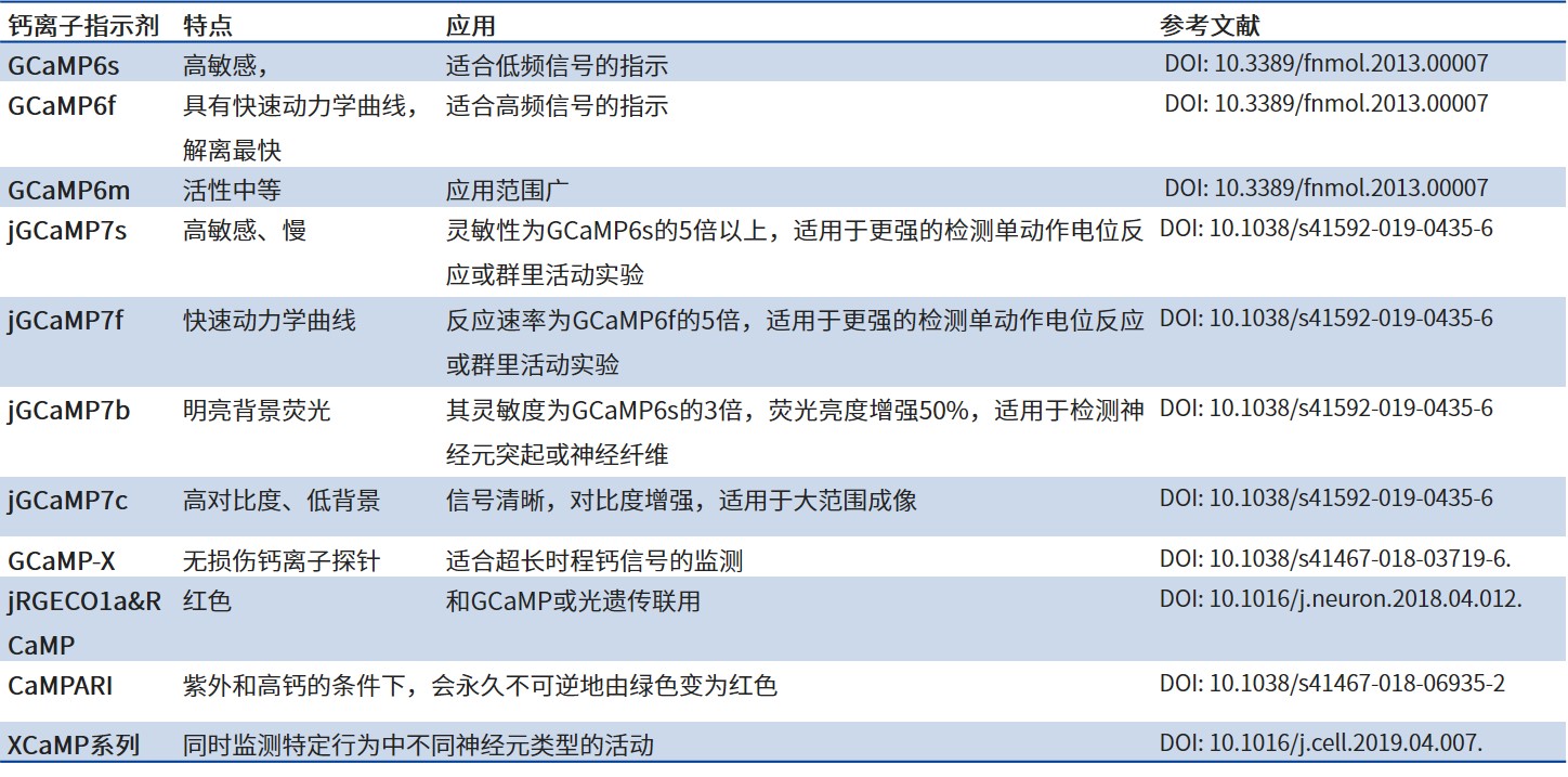 因而,钙离子成像技术的核心在于钙离子指示剂,现在广泛使用的钙离子指示剂有化学性钙离子指示剂(chemical indicators)和基因编码钙离子指示剂(genetically-encoded indicators)两类: