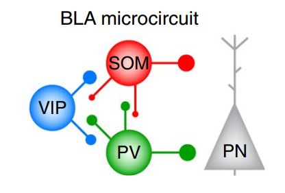 图1 杏仁核中中间神经元形成的微环路,VIP+