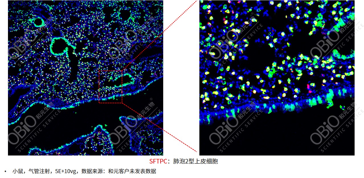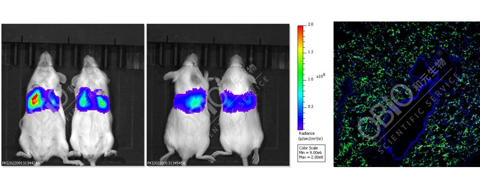 AAV-LungX尾门静脉打肺脏转导(5E+11vg/只,左:小猎物活体显像然而;右:荧光然而)