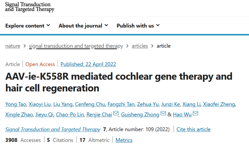 STTT | 上科大钟桂生团队协作与加盟者联合开发新技术AAV承载靶向药物耳聋基因组疗法