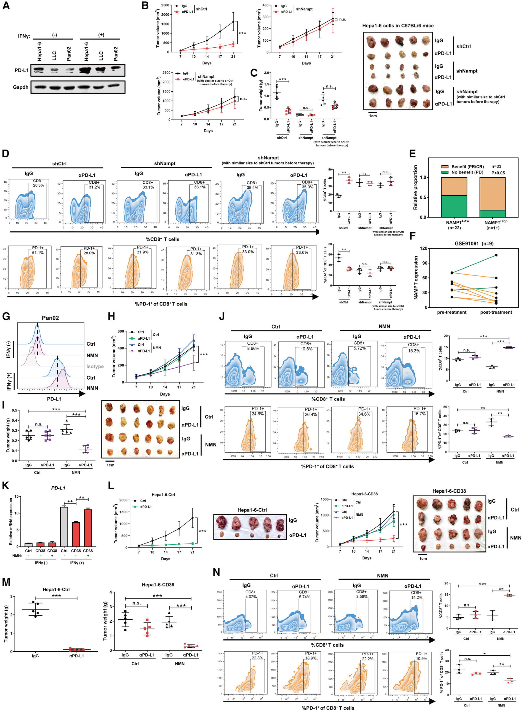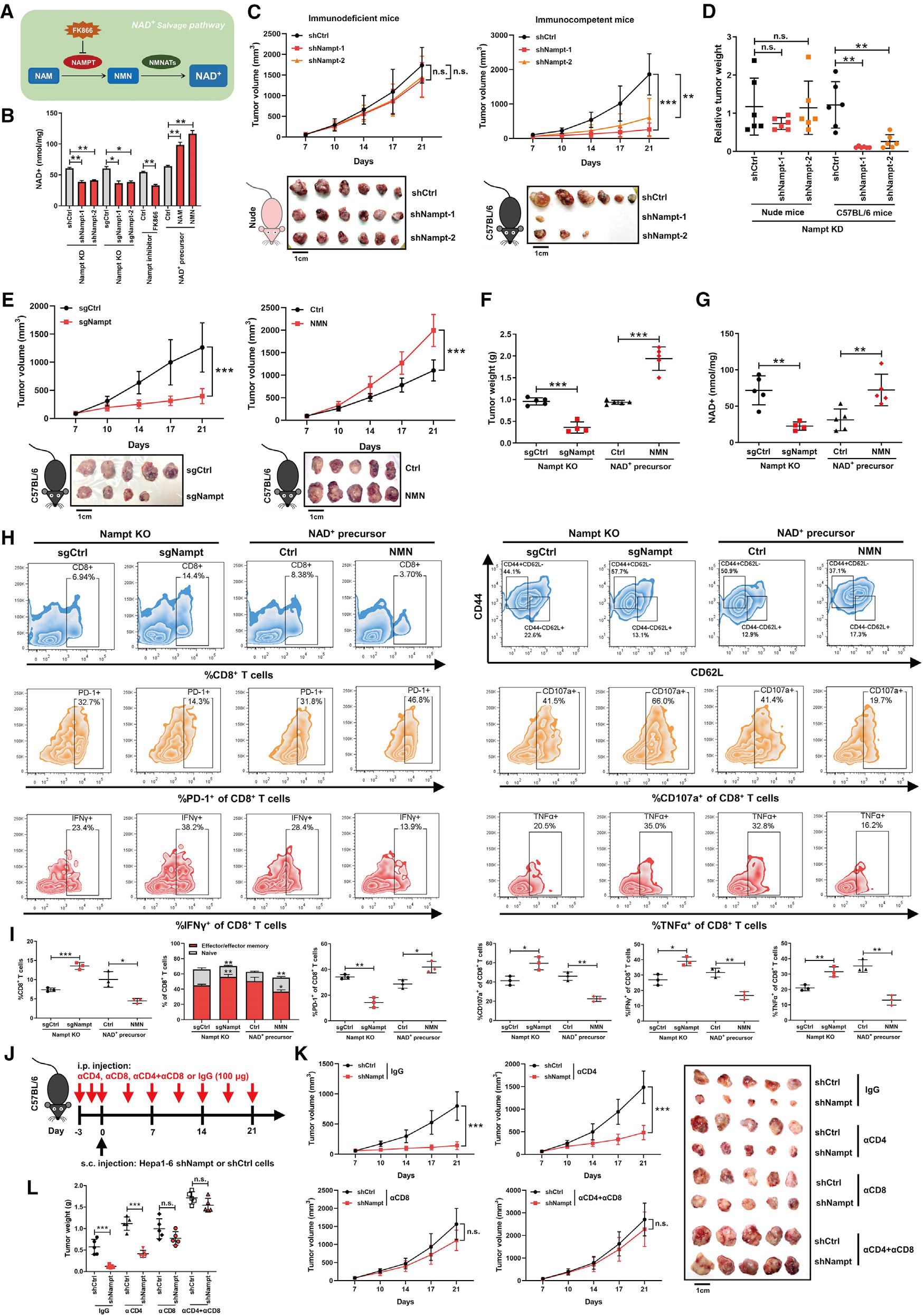 然而,临床试验数据显示,抗PD-1/PD-L1抗体等免疫治疗在实体瘤中的有效率低,仅20%左右。此外,长时间持续性的单一使用免疫检查点抑制剂治疗肿瘤并不能收到预期的疗效,甚至容易引发免疫耐受。因此,寻找行之有效的疗效预测标志和联合治疗是提高肿瘤免疫治疗效果和推进肿瘤精准免疫治疗的重要方法。NAD+代谢与癌症有关。然而,其在免疫检查点调控和免疫逃逸中的作用尚不清楚。