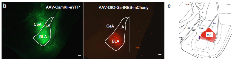 1、Thy1-Cre鼠配合AAV-DIO- DREADD病毒载体,操纵杏仁核BLA区Thy1阳性细胞改变恐惧记忆的消退和维持