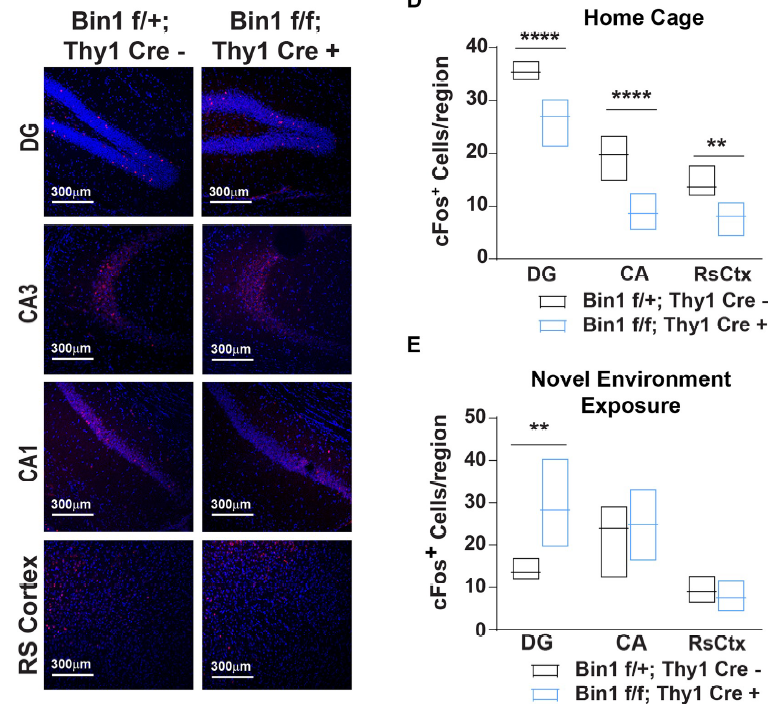 使用Thy1-Cre鼠和Bin1flox/flox鼠杂交,从而在兴奋性神经元中特异性地敲除Bin1基因。使用c-Fos染色标记活动的神经元数量。结果表明,在引入外界刺激的情况下,在海马及压后皮层中对照组小鼠的c-Fos阳性细胞数量均显著高于Bin1敲除组。但是在将动物暴露在新环境后,Bin1敲除鼠齿状回的c-Fos阳性细胞数量高于对照鼠。以上结果表明,在兴奋性神经元中敲除Bin1可以改变神经元的活动[3]。
