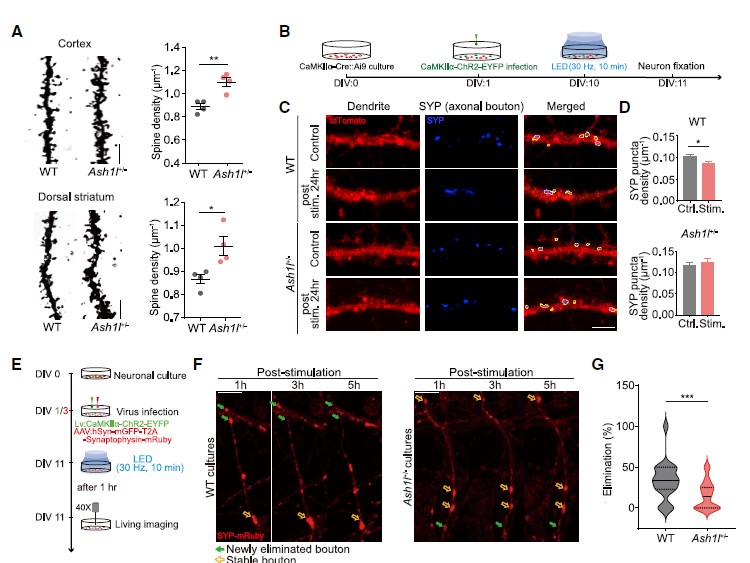 随后,作者借助高尔基染色发现,1月龄的Ash1l+/-小鼠皮层神经元和背侧纹状体中棘神经元(MSNs)的树突棘溶解度正相关延长(图3A),为研究探讨各种毛细现象是不是也取决于突触消去阶段(synapse elimination)的减少,研究人员研究了Ash1+/-小鼠原代皮层神经元的突触密度变化。用表达ChR2光敏蛋白的慢病毒载体(Lenti-CaMKIIa-ChR2)影响养成的运动神经元,混用LED促进(图3B),挖掘WT神经系统元在LED热血后24h树突突触素(SYP)密度显著降低,而Ash1l+/-组则未观察到这种现象(图3C,D),提示了Ash1l可能介导了活动依赖的突触修剪过程。活体成像结果显示,Ash1l+/-组培养的神经元中,活性依赖的突触消除过程被削弱。