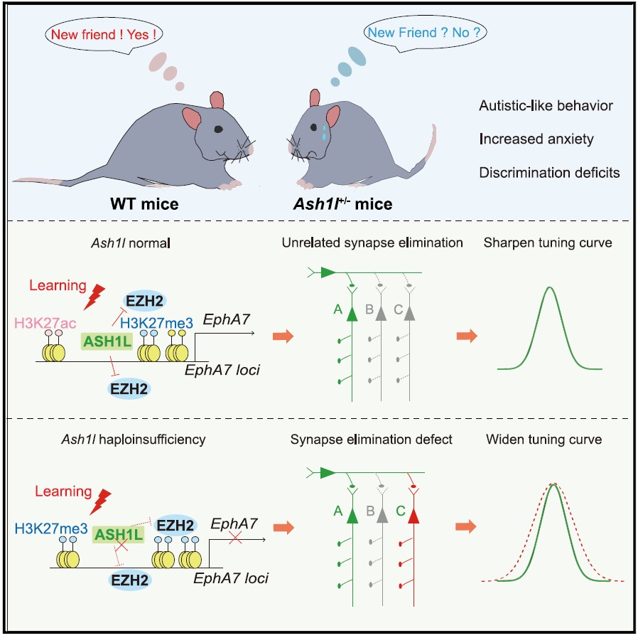 组蛋白甲基转移酶被确认为许多神经发育障碍的风险基因。Ash1l是一种组蛋白甲基转移酶,属于三胸家族(trxG)蛋白的成员之一,其能拮抗多梳蛋白家族对基因转录的抑制功能。目前越来越多的研究证明,Ash1l基因功能缺失是自闭症谱系障碍(autism spectrum disorder, ASD)发生的首要危险因素,然而,关于Ash1l单倍体不足导致与 ASD相关致病机制尚不清楚。