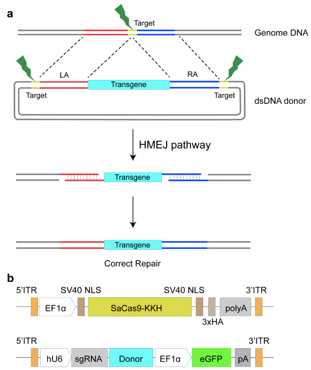 图1 制定HMEJ同源重新组合手术方法策划方案。a 重要性需求的sgRNA,制定HMEJ同源臂。b 鉴于AAV做体中递送各种质粒的双AAV手术方法制度,里面的AAV递送采用表现出来Cas9的各种质粒,其余的递送表现出来sgRNA及及随带同源臂的各种质粒。