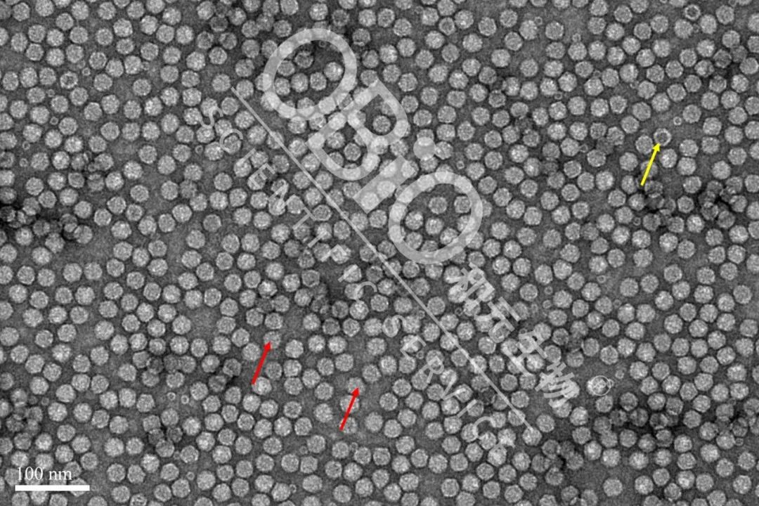 电镜后果:外包装DNADNA组的病原体颗粒肥料物状为空心颗粒肥料物状(橘红色上箭头标志);空病原体颗粒肥料物状其中有着,空洞(黄白色上箭头标志)