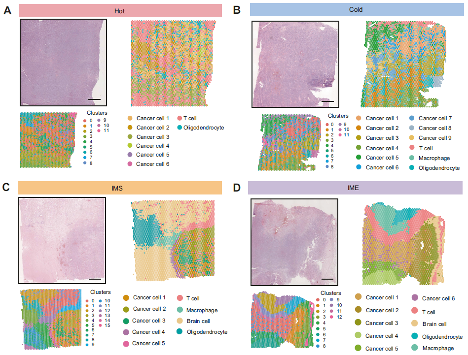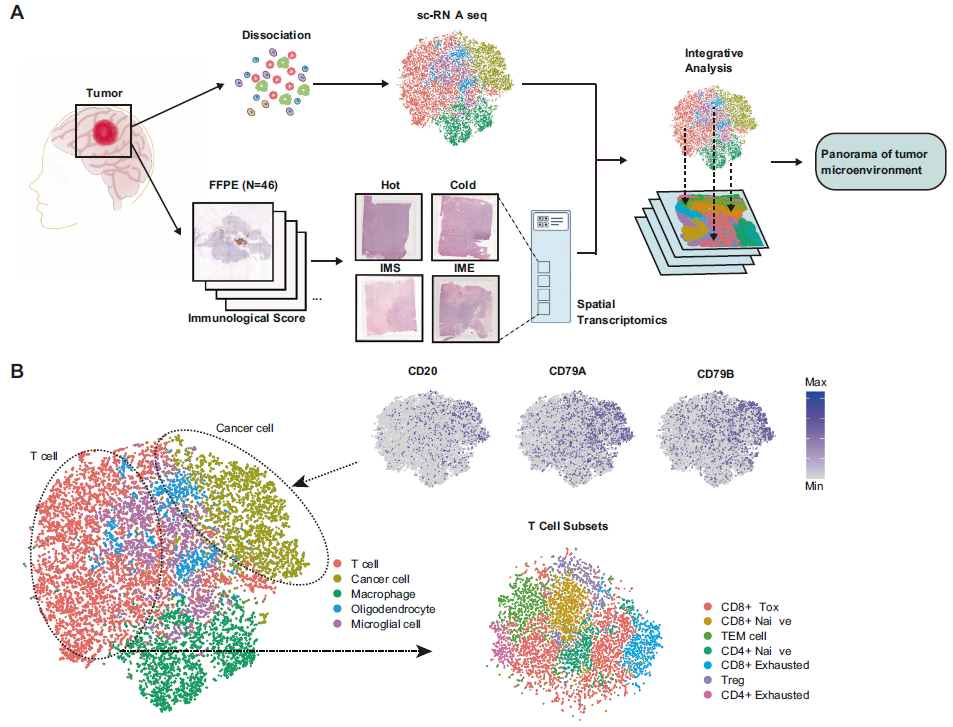 肿瘤微环境 (TME) 在肿瘤发生、发展、转移和药物敏感性中发挥重要作用。基于肿瘤-免疫系统相互作用模式,将 TME 分为四种主要类型“Hot”、“Cold”、“IMS”、 “IME”。据报道,在一些肿瘤中,如结肠癌和黑色素瘤,TME温度越高,患者生存率越高。然而,TME的高度异质性仍然是理解和治疗癌症的一个关键障碍。原发性中枢神经系统淋巴瘤 (PCNSL) 是一种高度侵袭性非霍奇金淋巴瘤,见于中枢神经系统 (CNS),包括脑、脊柱、脑脊液 (CSF) 和眼,PCNSL患者的生存率通常较低。尽管已在单细胞水平上研究PCNSL 的细胞组成和基因表达模式,但缺失了空间定位信息。因此,结合空间转录组测序来阐明 TME 的空间和时间发展模式以及关键的发生机制具有重要意义。