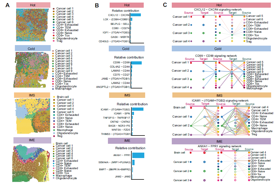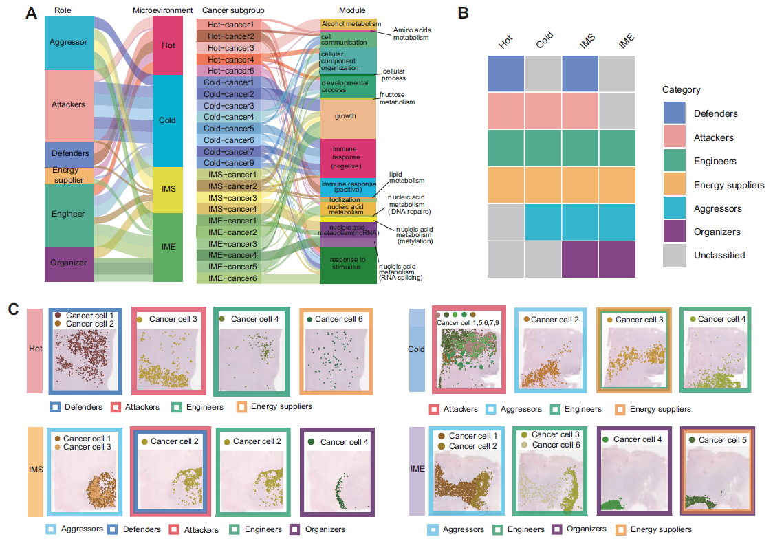 通过注释每种Cancer cell 功能以进一步阐明了肿瘤的空间异质性。将Hot中的被动防御肿瘤细胞定义为“defenders”,主要分布在Cancer cell 1和Cancer cell 2;从空间位置来看,主要分布在上半部分。Cancer cell 3具有非常强的固醇代谢功能以对抗免疫细胞,因此将其定义为“attacker”。Cancer cell 4和Cancer cell 6分散在整个空间中,负责细胞运动和能量供应,因此将其命名为“engineers”和“energy suppliers” (图3C)。Cold肿瘤中,没有处于免疫防御状态的癌细胞,表现出很强的负性免疫调节能力;值得注意的是,有一簇高度增殖的癌细胞(Cancer cell 2),将其命名为“aggressors” (图3C)。IMS 肿瘤中的癌细胞状态与前两种状态具有相似性,但也有其自身的差异。与 T 细胞直接接触的 IMS 肿瘤中的Cancer cell 2显示出正性和负性免疫调节状态,并且似乎处于聚集 T 细胞的过渡阶段,而相对靠近内部的Cancer cell 1和3显示出较强的增殖特征。由于Cancer cell 4在 IMS 肿瘤中的主要功能是 ncRNA 的代谢重编程,它被命名为“organizers”(图3C)。在 IME 肿瘤中也发现了相同的簇(organizers),似乎栖息在空间位置的核心,空间位置叠加在肿瘤的内部区域上。以Cancer cell 4为中心向外延伸,周围的Cancer cell 5与其相似,具有较强的 ATP 代谢能力(图3C)。