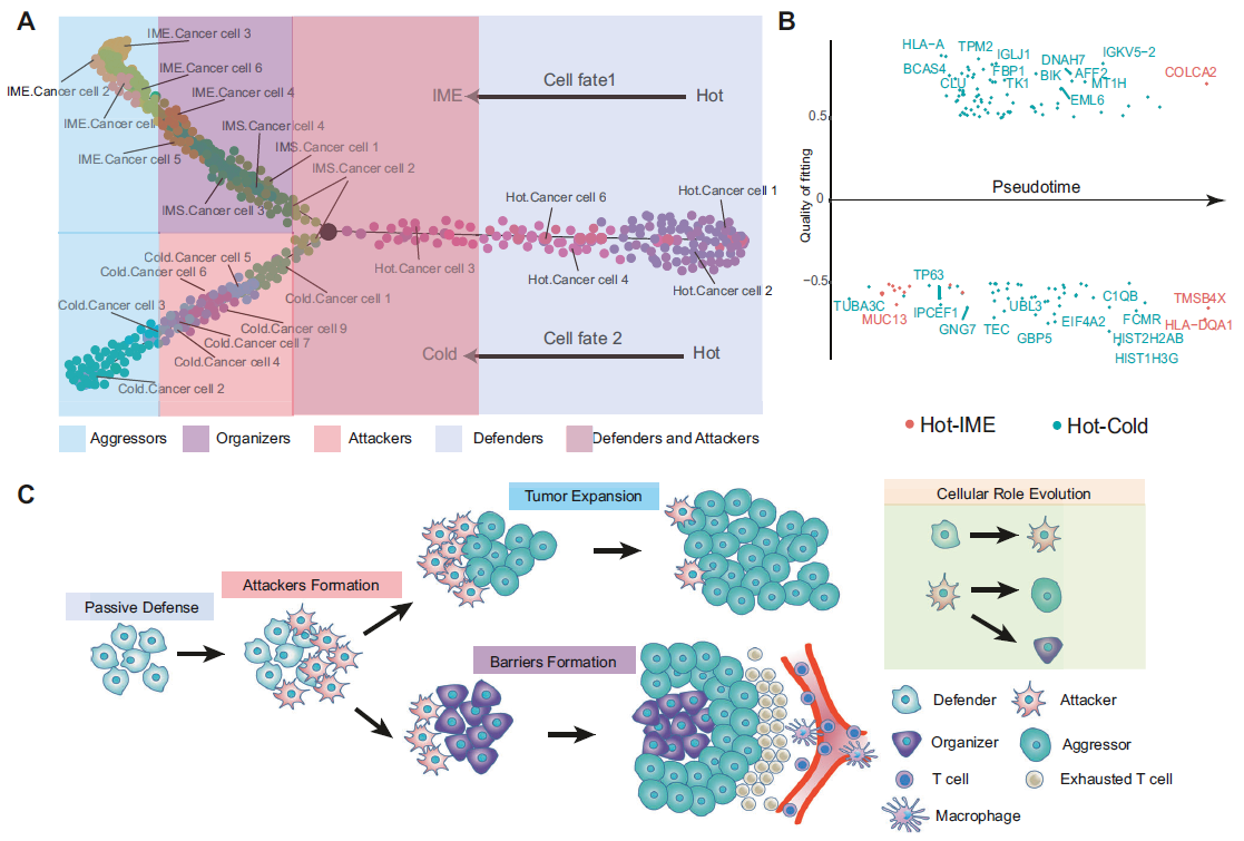 通过这种方式,将4个微环境中不同的肿瘤细胞亚群联系在一起,了解它们的相互关系和发育轴(图4C)。在经历了免疫细胞的挑战后,defenders衍生出attackers,attackers在免疫细胞压力较低的情况下生成aggressors扩大肿瘤;而organizers则衍生出组织肿瘤细胞构建免疫细胞高压区域的屏障环境,如血管分布较大的 IME 环境。将这种对肿瘤细胞选择性命运的免疫压力形式称为“Immune pressure-sensing model” (图4C)。