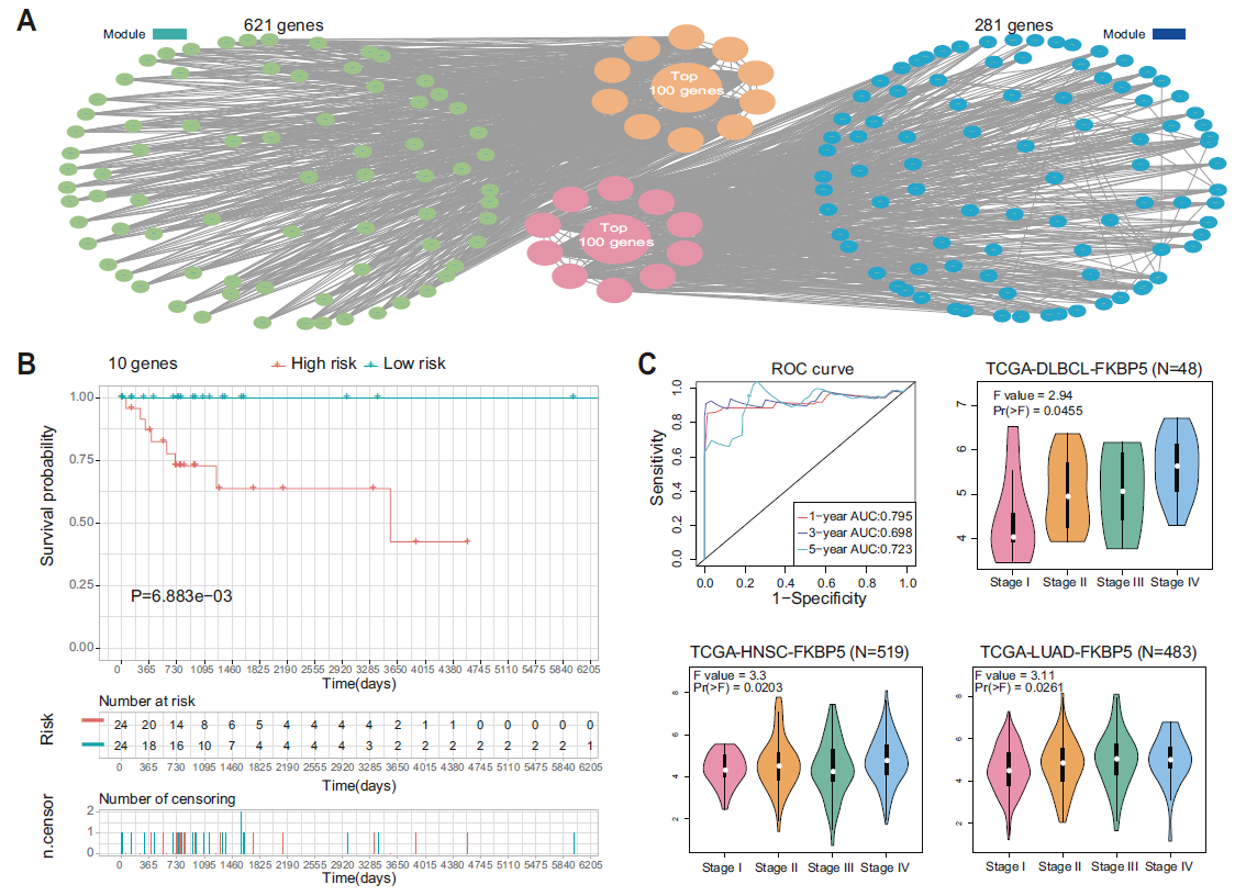 为探索organizers在血脑屏障中的关键作用,进行WGCNA分析,筛选出了2个与organizers具有显著性关联的模块(blue modules、green modules);随后通过模块基因的互作网路分析,最终筛选出 10 个与患者生存密切相关的基因(图 5A-C)。考虑到organizers的形成过程与肿瘤的进展相关,因此基于GEPIA和TCGA数据库对这些基因进行进一步分析,发现FKBP5 与患者的肿瘤进展密切相关(图 5C)。