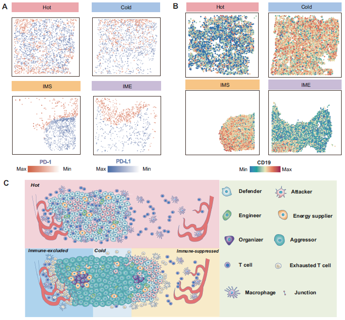 在 CAR-T 疗法中,主要靶点 CD19 也具有独特的空间表达差异。在Hot TME中, CD19 表达相对较弱,但在Cold TME和 IMS TME中,CD19表达显著增加。在 IME TME中,高表达 CD19 的肿瘤细胞甚至被包裹在肿瘤内部,使得 CAR-T 细胞难以发挥靶向作用,这很可能是治疗效果大大降低的原因之一(图7B)。