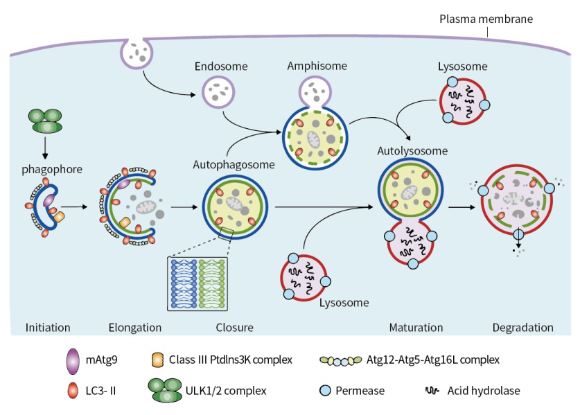 自噬是细胞利用溶酶体降解途径进行自我吞食的过程,是细胞在营养不足等压力情况下维持生存的主要代谢途径。自噬主要分为三类,即巨自噬(Macroautophagy)、微自噬(Microautophagy)、分子伴侣介导的自噬(Chaperone-mediated autophagy)。自噬在肿瘤、神经退行性疾病、心血管疾病等多种疾病中发挥重要作用。
